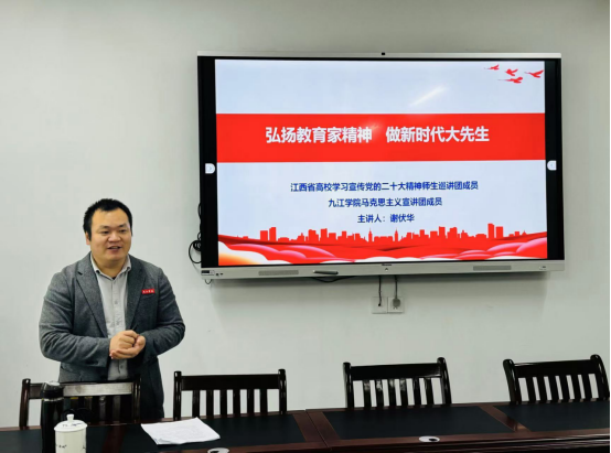 为深入学习贯彻习近平总书记关于教育的重要论述,大力弘扬教育家精神,进一步提升学院师德师风建设水平。11月20日,马克思主义学院副院长谢伏华博士为beat365官网教职工开展了一场以“弘扬教育家精神, 做新时代大先生”为主题的师德师风宣讲活动,此次活动由院党委书记王英姿主持。