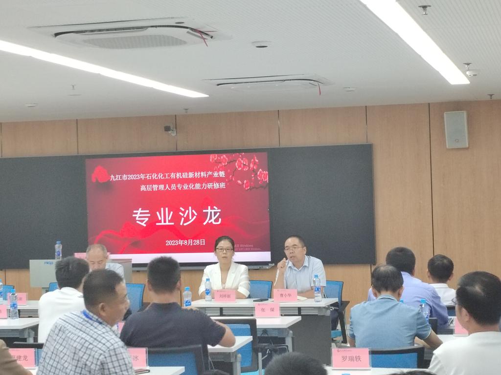 8月28日—30日,由九江市工信局,beat365中文版官网入口、化学化工学院在九江银行研学中心举行了三场石化化工——有机硅新材料产业链高层管理人员专业学术沙龙活动。来自九江石化产业园区、彭泽矶山化工园区等全市化工园区的管委会主任、江西理文化工有限公司、江西心连心化学工业有限公司、九江善水化工科技股份有限公司等石化化工和有机硅新材料企业的负责人、湖北和安徽省辅助配套企业等企事业单位的主要负责人与beat365中文版官网入口化学化工学院、资源环境学院的教授博士等100余人参与了沙龙讨论。并先后特邀中国石油和化学工业联合会化工新材料专业委员会秘书长卜新平、陕西科技大学安秋凤教授、华东理工大学江先龙教授级高工三位专家与研修班学员进行了面对面的交流互动。